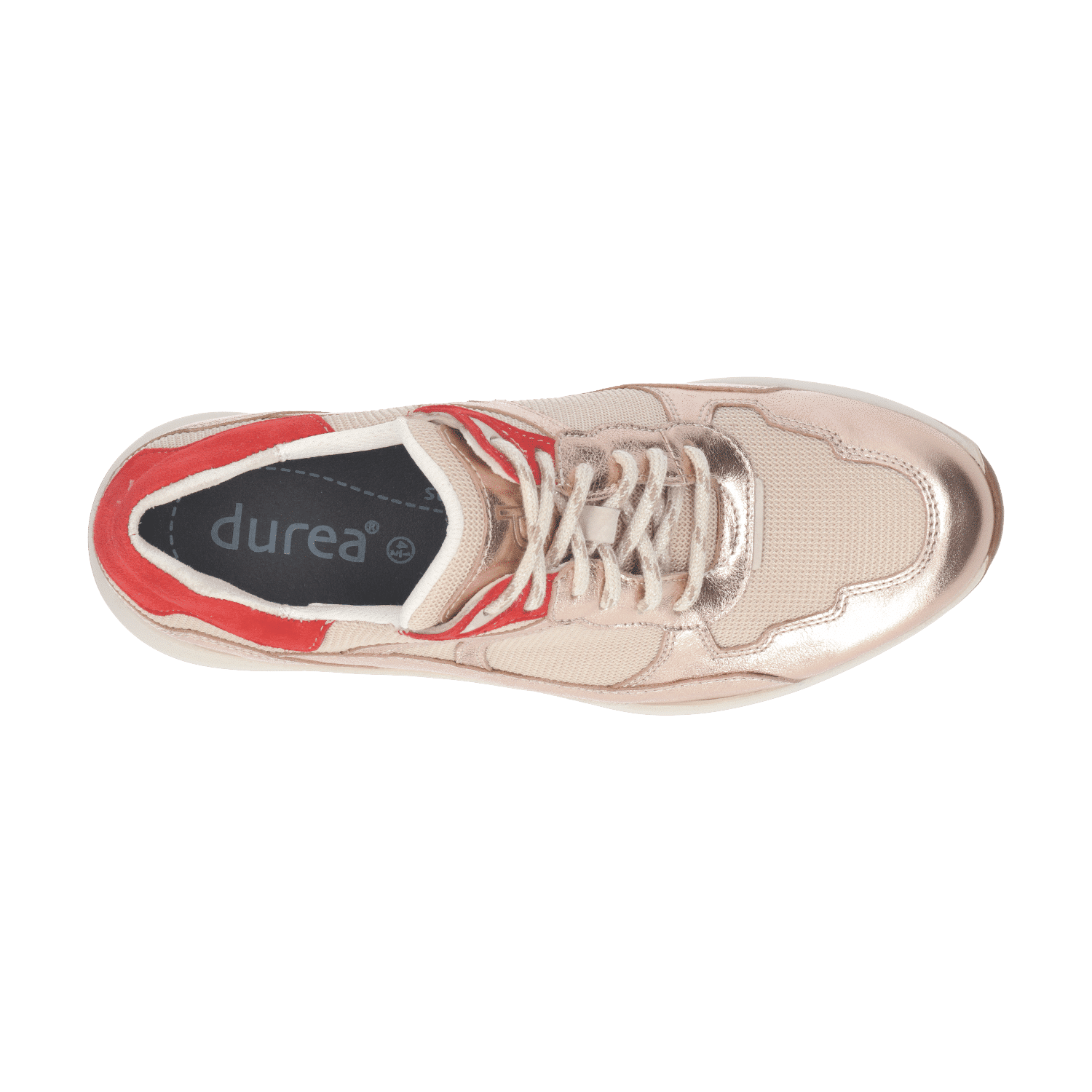 Met een comfortabel paar sneakers ligt de wereld aan je voeten. Trainers, een kruising tussen een stijlvolle, sportieve schoen en een hardloopschoen, zijn op dit moment dé sneaker voor alledag. Ideaal om te combineren onder een jeans of een broek, maar hij staat ook verrassend leuk onder een rok of jurk. Dit model van Durea kenmerkt zich door een combinatie van frisse kleuren en uitgesproken materialen. Bijzondere details zijn de door stikwerk gecreëerde vlakken en het merkembleem op de tong. Ze geven de schoen een speels uiterlijk, terwijl de fraaie afwerking zorgt voor een volwassen look.