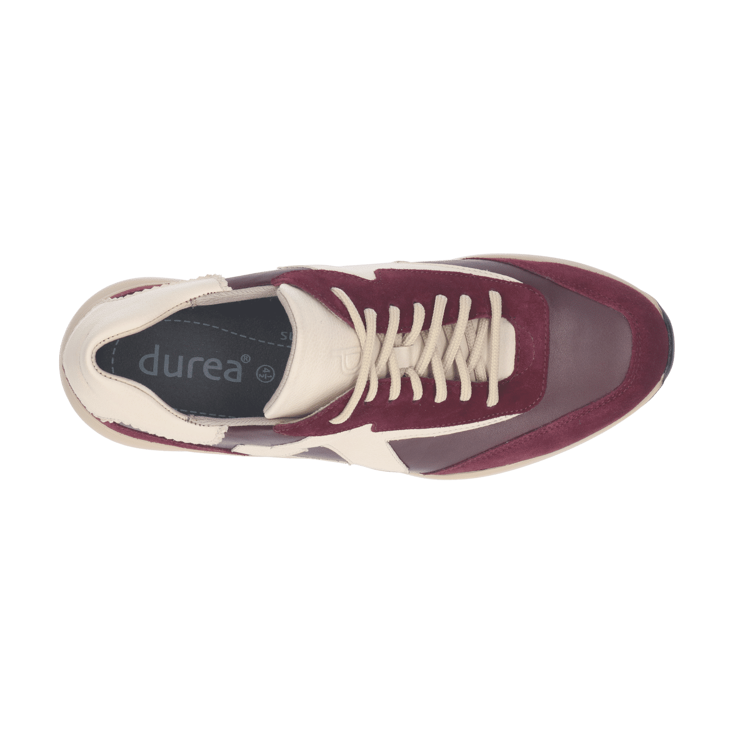 Het bovenwerk heeft een sportieve uitstraling door de dynamische vlakverdeling en de subtiel verlengde tong. Voor extra finesse zorgen het kartelrandje van het leer bij de hiel en het Durea merkembleem. Samen met het decoratieve stikwerk maken deze details dit model tot een echte blikvanger.
