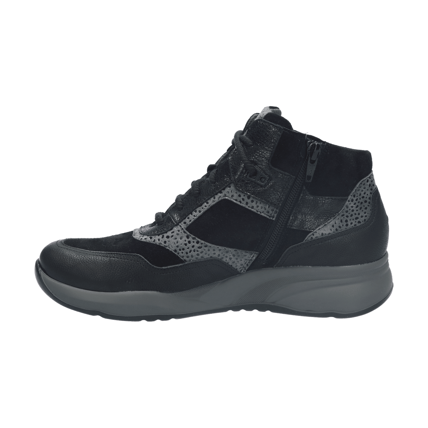 Aan het gebruiksgemak is uiteraard ook gedacht: dankzij de veter-rits-combinatie kun je de sneaker heel gemakkelijk aan- en uitdoen én goed afstellen om de voet. Extra bijzonder is dat de vetersluiting verschillende draagopties biedt. Zo kun je de veters door de bovenste ringen rijgen en dan strikken of je kiest ervoor om de bovenste veterringen over te slaan. Daarmee komt de schoen bovenin wat losser te zitten, wat een nonchalante uitstraling geeft. Kies je voor de tweede optie? Je zal merken dat de schoen nog steeds goed om de voet sluit. Dat komt doordat één paar veterringen iets naar achteren is geplaatst.