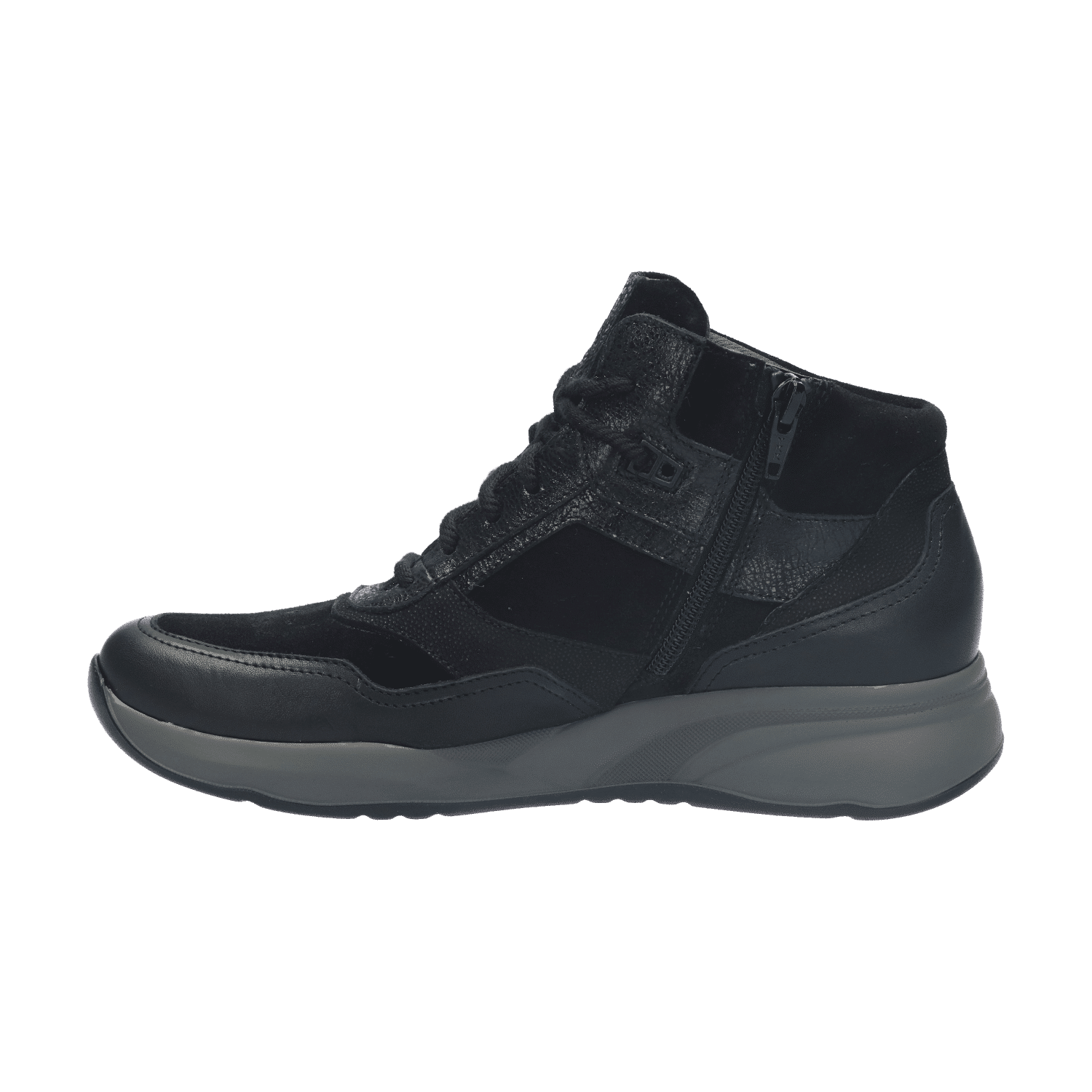 Aan het gebruiksgemak is uiteraard ook gedacht: dankzij de veter-rits-combinatie kun je de sneaker heel gemakkelijk aan- en uitdoen én goed afstellen om de voet. Extra bijzonder is dat de vetersluiting verschillende draagopties biedt. Zo kun je de veters door de bovenste ringen rijgen en dan strikken of je kiest ervoor om de bovenste veterringen over te slaan. Daarmee komt de schoen bovenin wat losser te zitten, wat een nonchalante uitstraling geeft. Kies je voor de tweede optie? Je zal merken dat de schoen nog steeds goed om de voet sluit. Dat komt doordat één paar veterringen iets naar achteren is geplaatst.