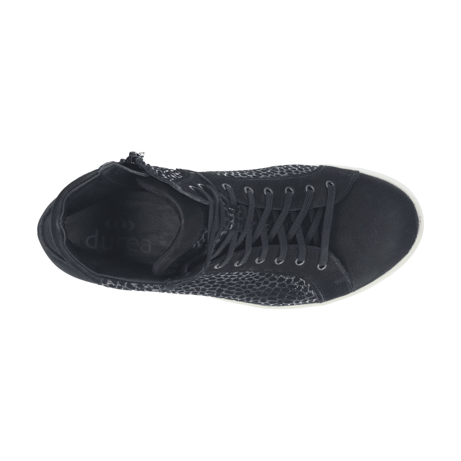 Kies je voor de tweede optie? Je zal merken dat de schoen nog steeds goed om de voet sluit. Dat komt doordat één van de veterringen iets naar achteren is geplaatst. Ook erg handig: deze sneaker is niet alleen voorzien van een verwisselbaar voetbed (zoals alle Durea schoenen), maar ook van een extra tussenzooltje dat eruit kan worden gehaald om extra ruimte te creëren voor de voet.