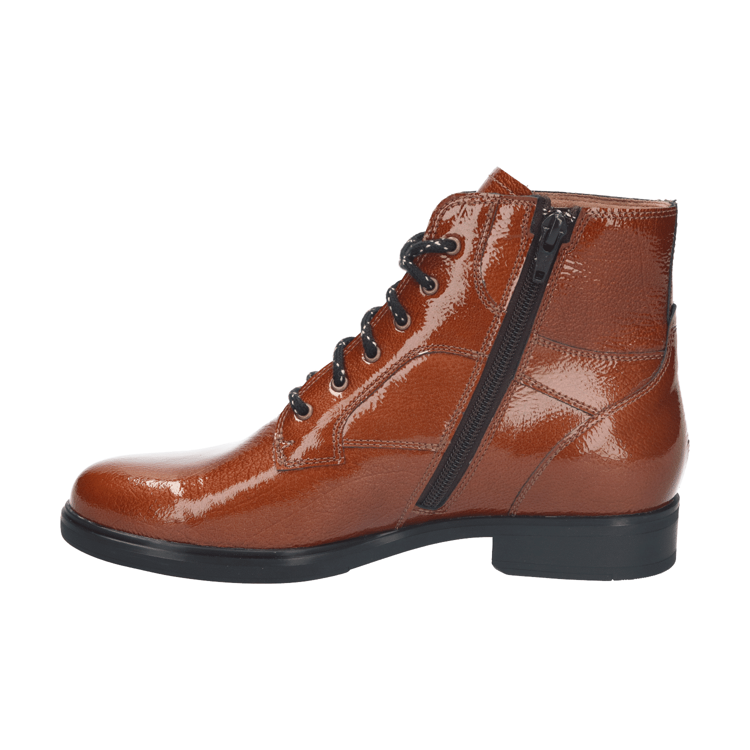 De schoen is fraai afgewerkt met een merkstempel op de tong en stikwerk belijningen die het elegante silhouet benadrukken. De metalen veterringen geven de schoen een stoere uitstraling. Voor optimaal gebruiksgemak is dit model voorzien van een handige rits aan de binnenzijde van de schacht, waardoor je de laarsjes snel aan- en uittrekt zonder steeds de veters te hoeven strikken.