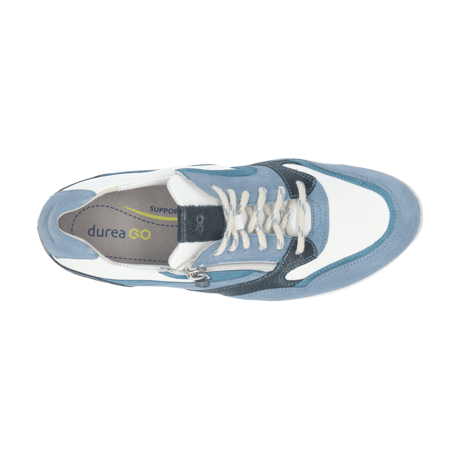 Dankzij de veter-rits-combinatie kun je de sneaker heel gemakkelijk aan- en uitdoen én goed afstellen om de voet. Wat je niet meteen ziet, maar wel voelt, is de extra zachte polstering bij de hiel. Deze biedt comfortabele ondersteuning aan de achterzijde van de voet. De zool is uitgerust met Durea GO technologie die een natuurlijke houding stimuleert en zorgt voor een stabiel looppatroon. Zo wordt de druk gelijk over de gehele voet verdeeld en kost staan en bewegen minder energie.