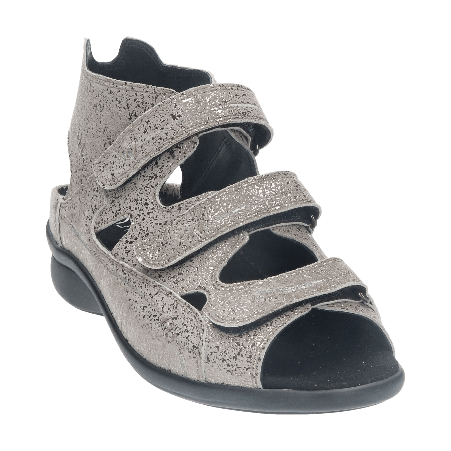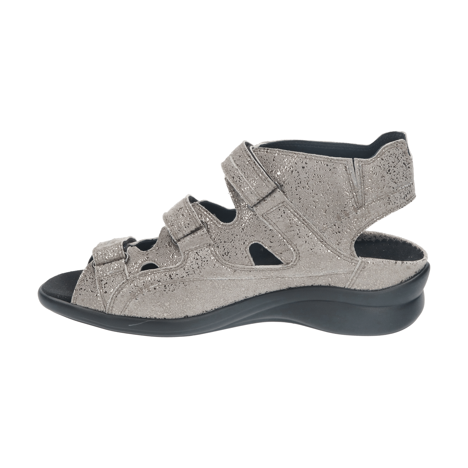 Het model heeft drie klittenbandsluitingen; een op de voorvoet en twee over de wreef. De brede banden zijn individueel verstelbaar en zorgen ervoor dat de sandaal gegarandeerd goed aan de voet blijft zitten. Aan de bovenzijde van de schacht is dit model uitgerust met elastiek voor een aansluitende pasvorm.