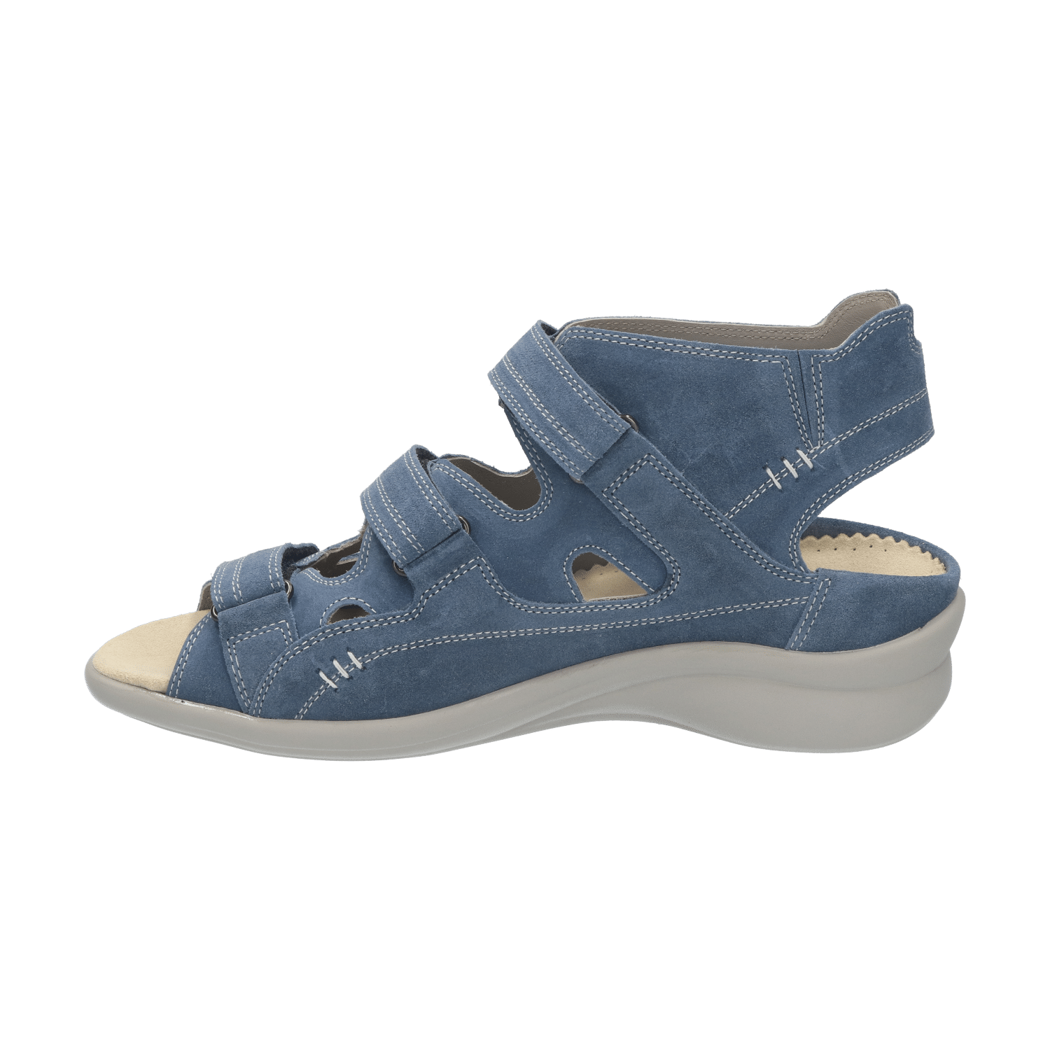 Het model heeft drie klittenbandsluitingen; een op de voorvoet en twee over de wreef. De brede banden zijn individueel verstelbaar en zorgen ervoor dat de sandaal gegarandeerd goed aan de voet blijft zitten. Aan de bovenzijde van de schacht is dit model uitgerust met elastiek voor een aansluitende pasvorm.